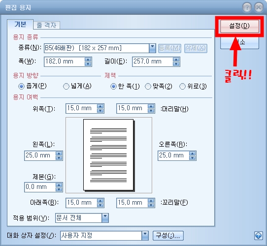 따라서 여기서는 편집용지를 B5 크기로 설정하는 법을 소개할까 합니다.