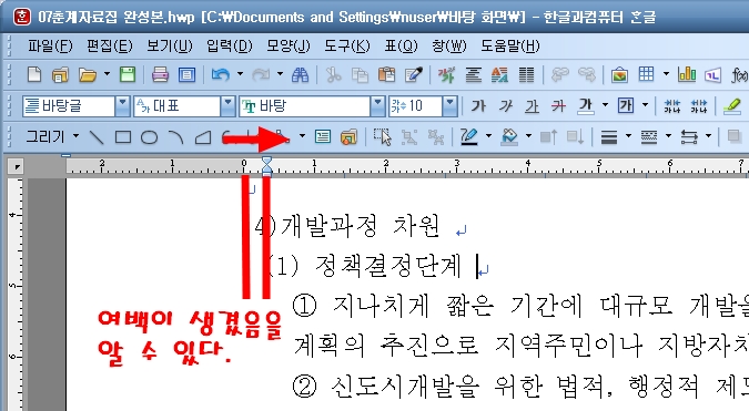 ③ 설정한 여백이 잘 적용되었음을 문서상에서 알 수 있습니다. 여백의 설정은 문단 모양창에서 뿐만 아니라 위의 눈금에서 마우스로 드래그하여 설정할 수 있습니다. 참고로 5.0pt씩 움직입니다.