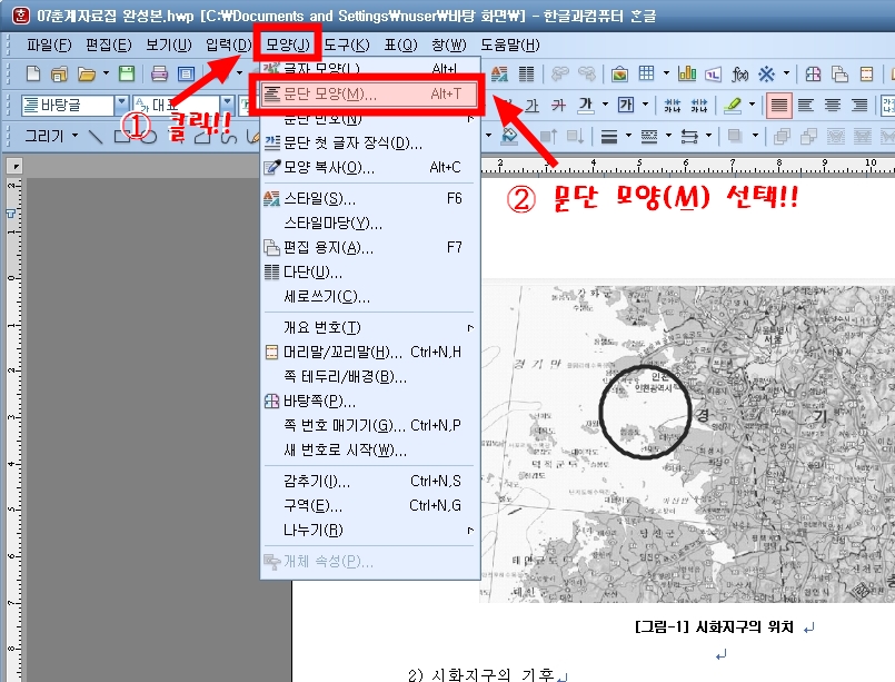 ① 우선 <모양(J)에서 문단 모양(M)을 선택합니다.