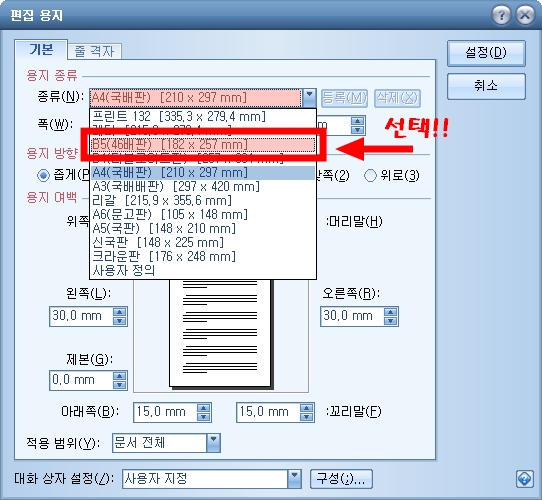④ 선택가능한 용지목록에서 우리가 필요한 B5를 선택하여 주고 설정(D)을 클릭해 줍니다.