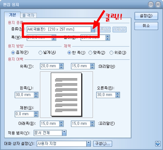 ③ 편집 용지 창이 뜨면 용지 종류에서 종류(N)부분을 눌러 선택가능한 용지 목록을 펼쳐줍니다.