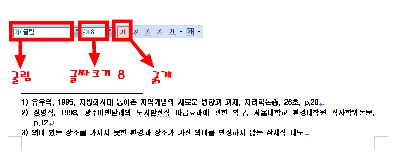 삽입한 각주에 대해서는 다음과 같은 서식을 지정해 줍니다.(이것은 인용문의 출처뿐만이 아니라 각주에 삽입된 글 모두에게 적용됩니다.)