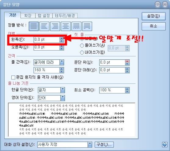 ② 문단모양 창에서 여백란을 보면왼쪽(F)이라 되어 있는 부분이 있습니다. 이곳을 문단분류에 맞게 설정해 주시면 됩니다.