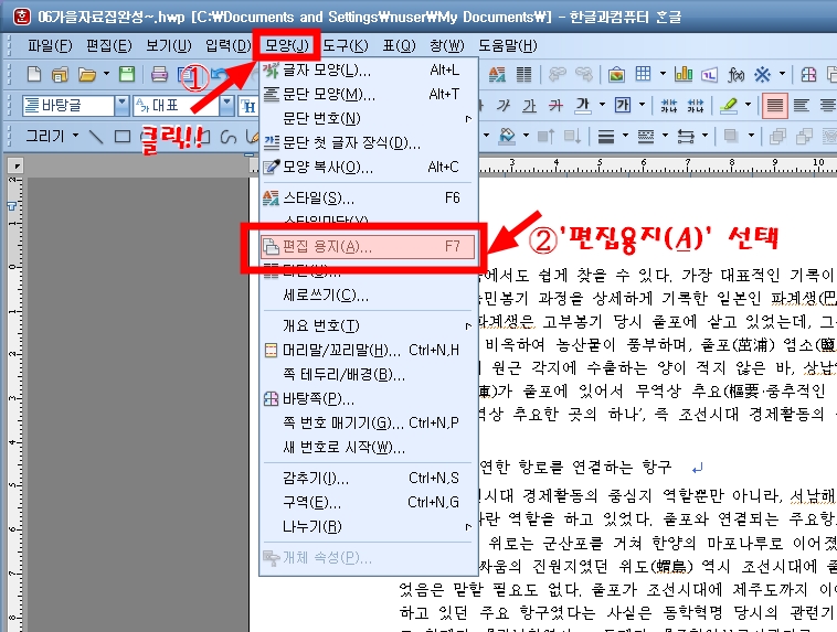 ① 그럼 다음의 A4 크기로 작성된 페이지를 변경해 보겠습니다. 물론 가급적이면 문서의 작성 이후보다는 이전에 미리 용지의 크기를 변경하시는 것을 권장합니다.