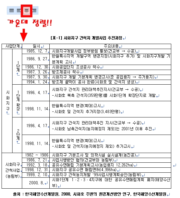 표를 설정에서 글자처럼 취급을하고 서식에서 가운데정렬을 한 뒤라면 표 아랫줄에 출처를 달아 줍시다. 출처표기는 논문 및 단행본에서 와 동일한 방법을 사용합니다.