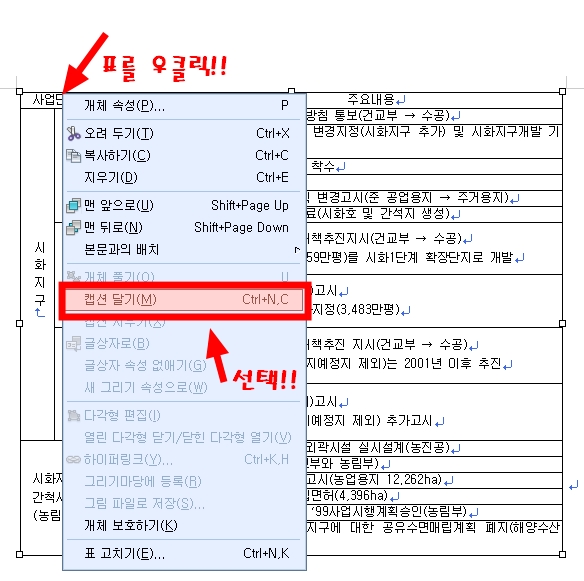 우선 캡션을 다는 것은 그림에 캡션을 다는 것과도 같습니다. 차이가 있다고 하면 그것은 캡션의 위치일 것입니다. 우선 캡션을 달기 위해선 표를 우클릭하여 캡션달기(M)를 클릭하여 표에 캡션을 달아주어야 합니다.