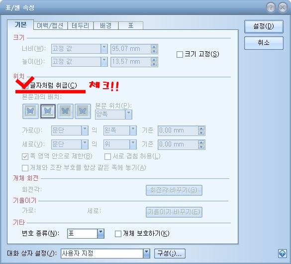 개체속성(P)부분에서 기본부분에 있는 위치를 보면 글자처럼 취급(C)이 있습니다. 체크해줍시다.