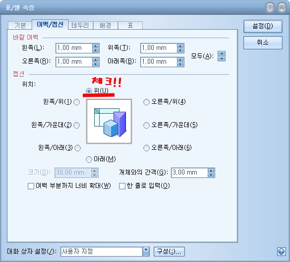 아래의 그림이 묘하게 익숙하실 겁니다. 바로 위의 그림편집때도 많이 들락거린개체속성(P)부분입니다. 당연히 여백/캡션 탭을 선택하여준 다음 캡션의 위치부분에서 위(L)를 체크해 줘야 합니다.