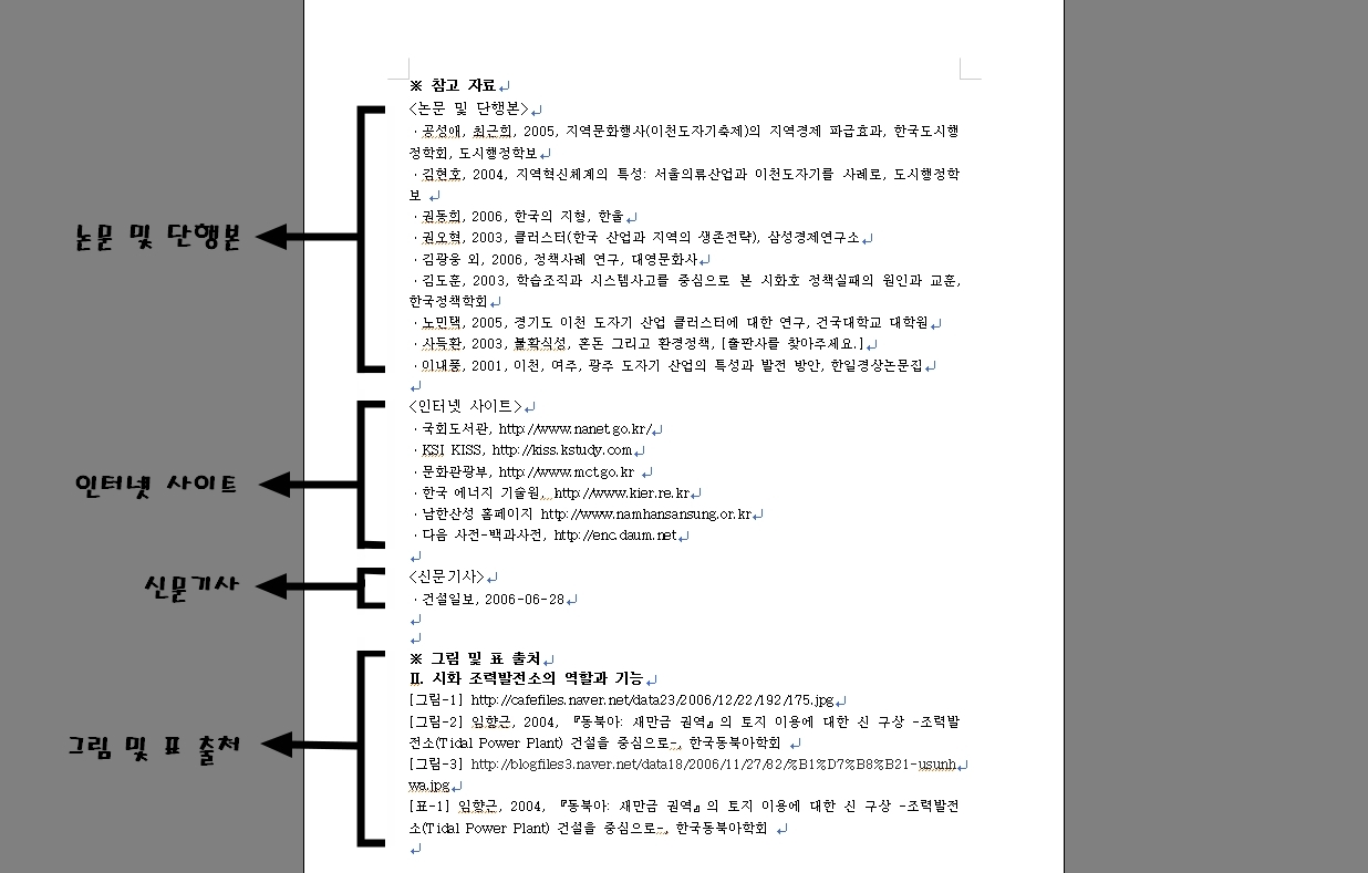 논문 및 단행본의 출처 표기 순서가 중요한 이유를 꼽으라면 아마도 그림 및 표 또는 인용문의 출처표기시 이것이 논문이나 단행본으로 부터 인용된 것일 경우에 이 형식을 따라주어야 하기 때문 입니다.